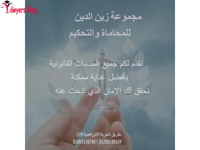 إشكالياتك القانونية في طريقها للحل مع مجموعة زين الدين للمحاماة والتحكيم تحت رعاية د/ أشرف زين الدين الشريف المحامي . 12 محامي تخصصي في جميع المجالات القانونية المختلفة (مدني - جنائي - أحوال شخصية "أسرة" - شركات - قضايا البنوك - قضايا عمالية - عقارات - شرعي) خبراتنا القانونية تجاوزت الثلث قرن أمام الدوائر القضائية المختلفة نحل لك جميع العقد القانونية فريقنا متخصص لجميع الاشكاليات القانونية نبذل اقص...